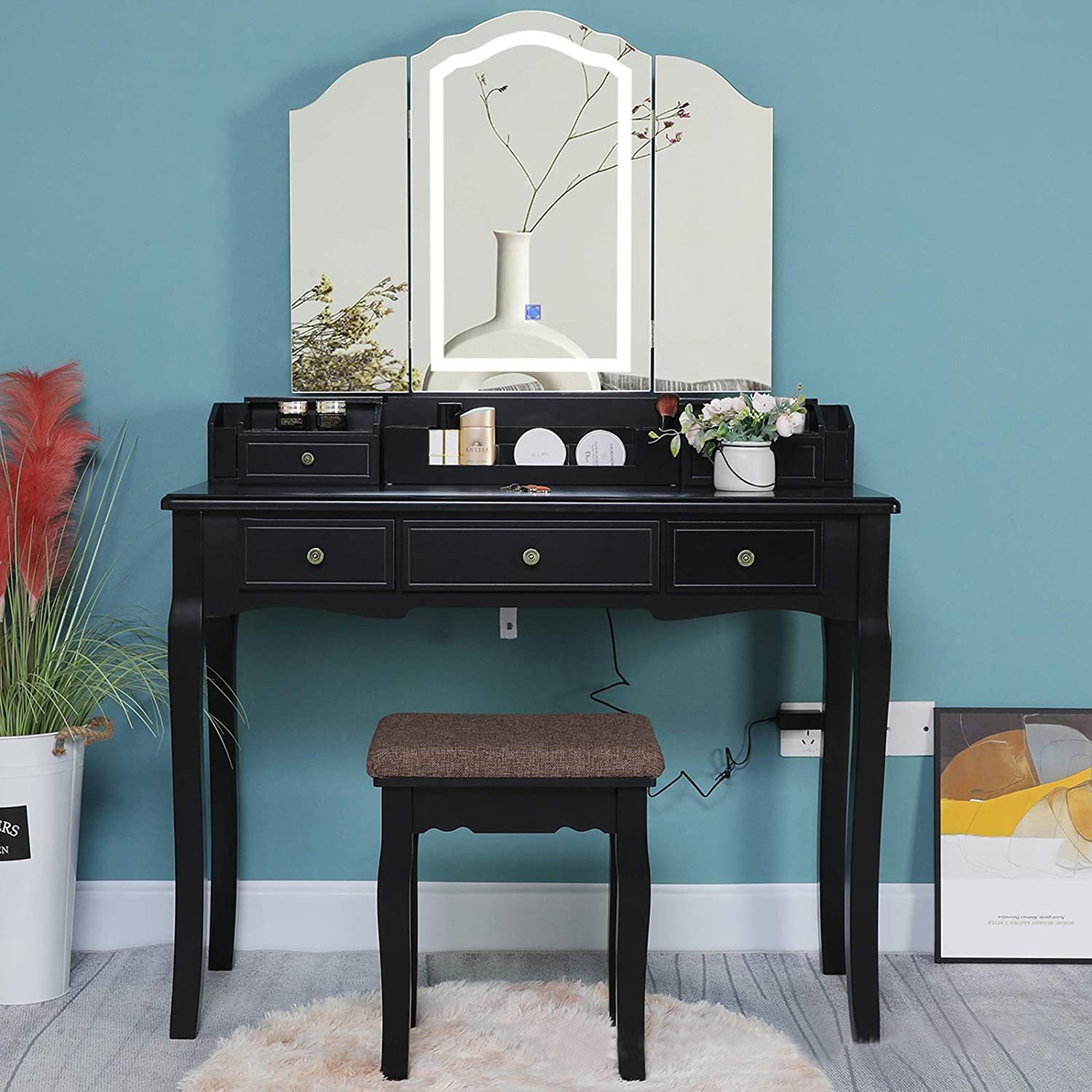 This 4 drawers storage makeup table was manufactured in Fujian, China. The product Includes a 3 folded mirror and cushioned stool perfect to bedroom or dressing area.